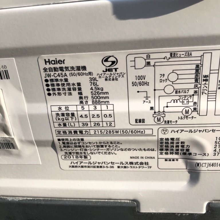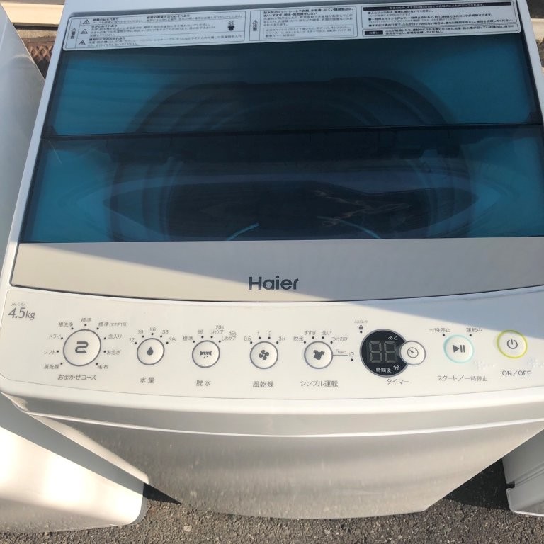 今回草加市学園町のお客様からご相談いただいたのは、ハイアール製の全自動洗濯機「JW-C45A」。