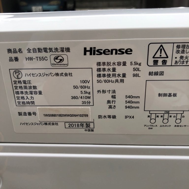 東京都荒川区東日暮里にて、ハイセンス製全自動洗濯機「HW-T55C(5.5kg)」を回収しました。2018年製で状態良好、リユース整備後は次の利用者に安心してご利用いただける見込みです。