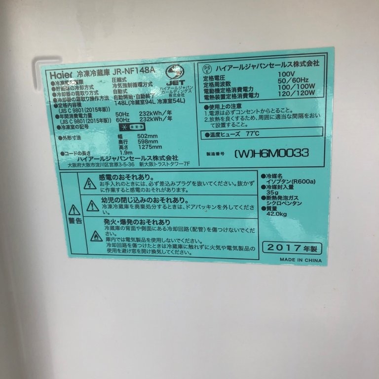 | メーカー | Haier(ハイアール)JR-NF148A |