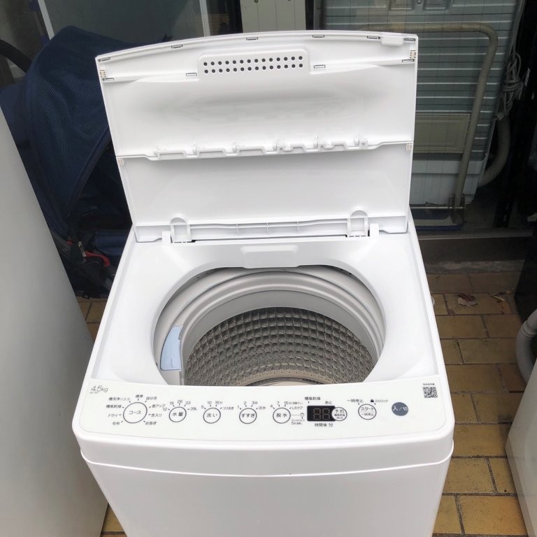 今回の機種は、ハイアール製 縦型洗濯機「BW-45A」。洗濯容量4.5kg、標準使用水量76Lの全自動洗濯機です。